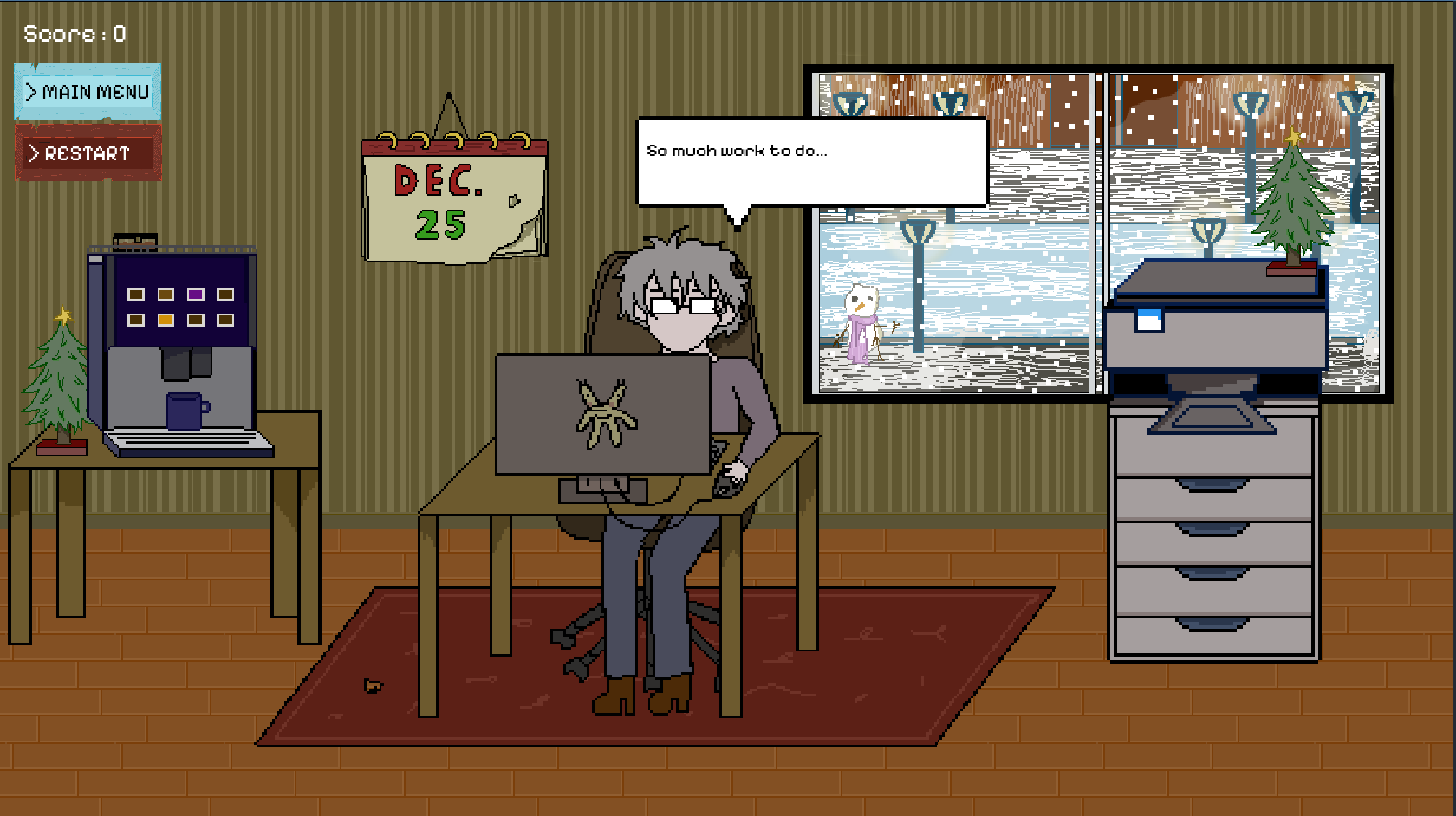 Cold Deadlines is a mini rhythm game where you must focus on typing the right keys while chaos unfolds around you. Stay sharp, keep your fingers moving, and survive the freezing office!